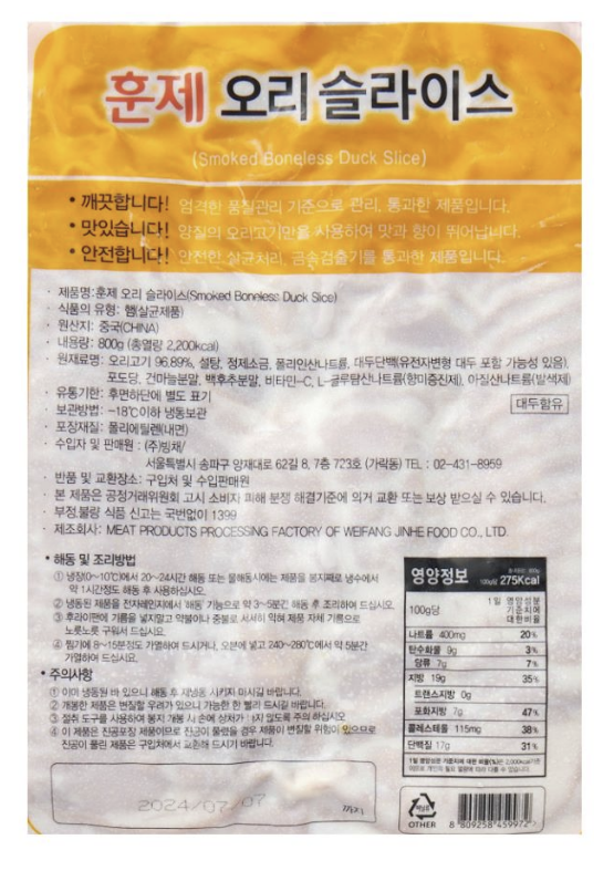 농우 냉동 훈제오리 슬라이스 800g/PK